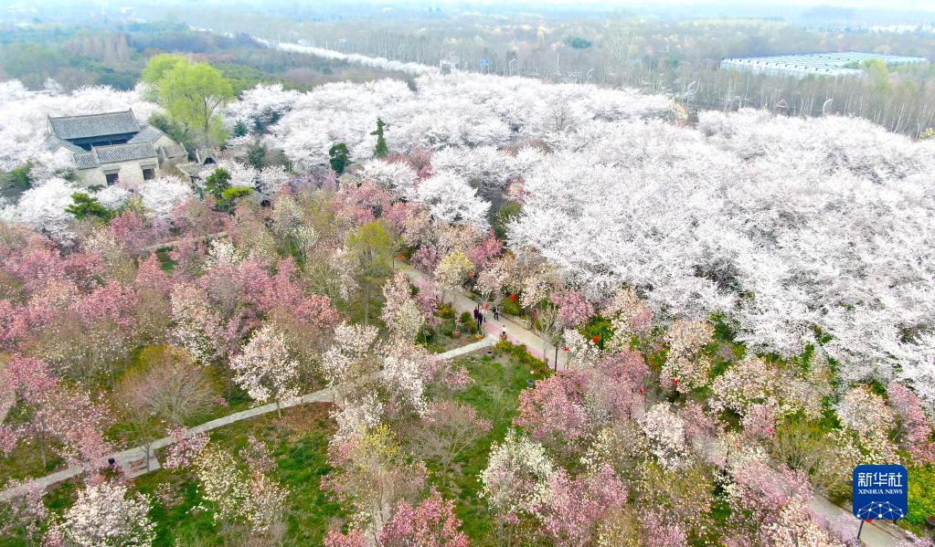 這是3月19日在河南省許昌市鄢陵縣拍攝的唐韻櫻花園(無人機照片)。