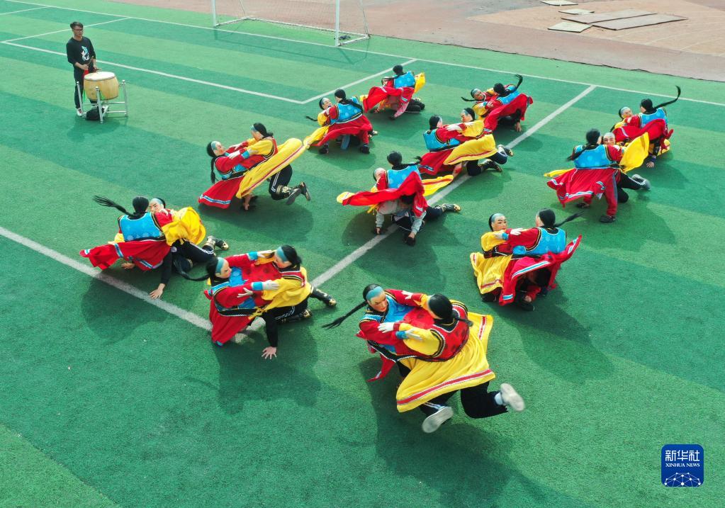 3月20日,隆化縣職教中心學生在練習國家級非遺項目“二貴摔跤”(無人機照片)。