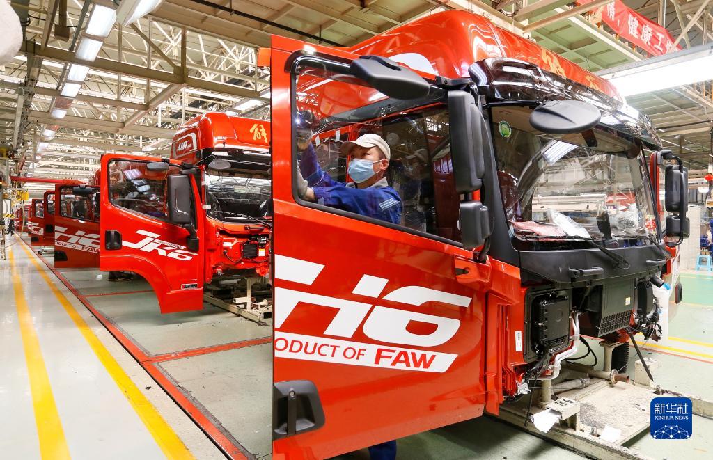 3月20日,在位于山東省青島市即墨區的一汽解放青島汽車有限公司總裝車間,工人在組裝汽車。