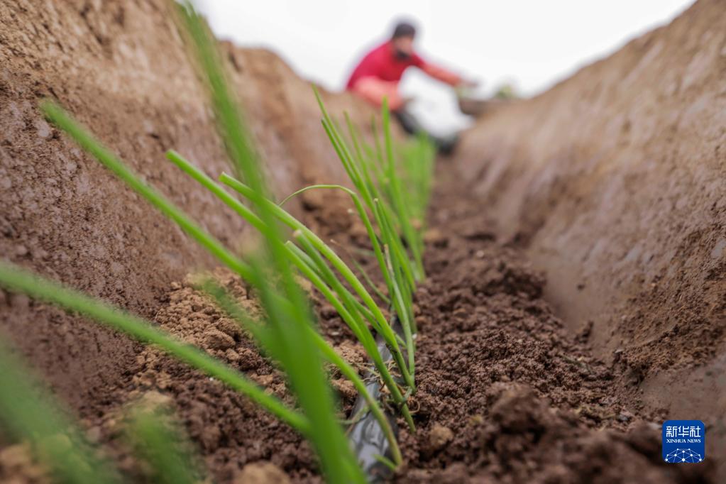 3月20日,河北省遵化市平安城鎮農民在田間栽植大蔥。