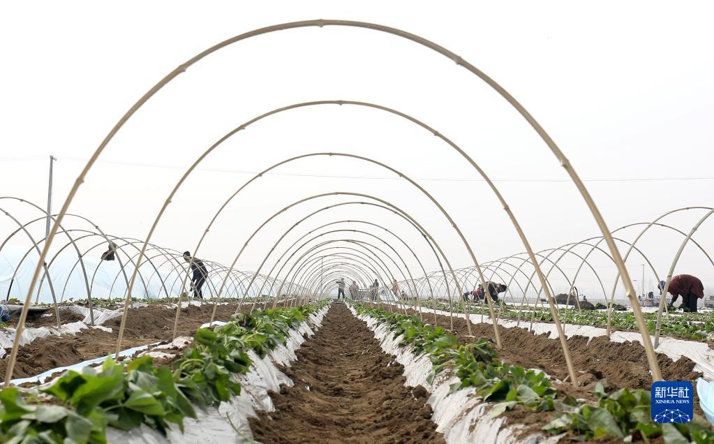 3月20日,在河北省石家莊市行唐縣南橋鎮東安太莊村紅薯種植基地,農戶在進行搭棚覆膜作業。
