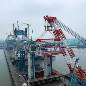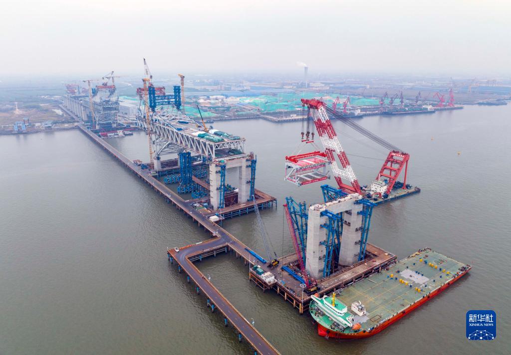 當日,常泰長江大橋主航道橋泰州側首節段鋼桁梁成功架設,標志著常泰長江大橋主航道橋鋼桁梁架設工作全面展開。