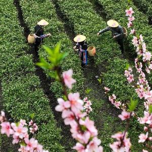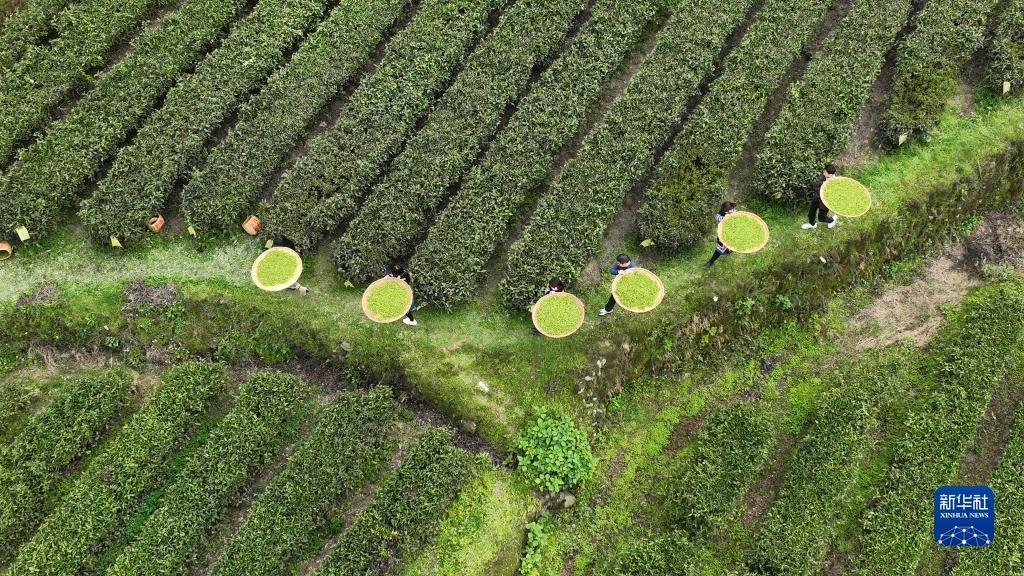 3月20日,在湖南衡陽常寧市塔山瑤族鄉,茶農在茶園采茶(無人機照片)。