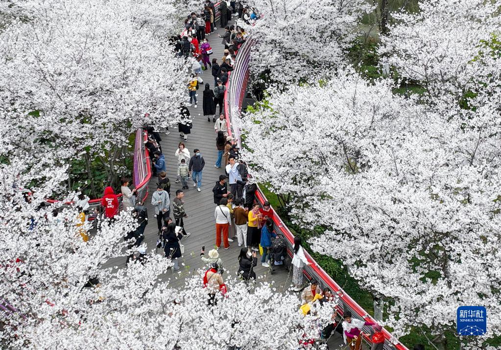 3月20日,游客在浙江省寧波市鄞州區櫻花公園游玩賞花(無人機照片)。
