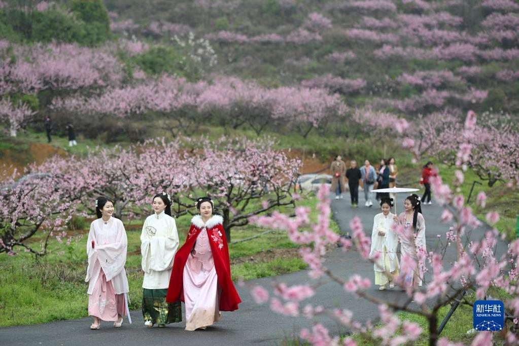 3月20日,游客在湖南省郴州市安仁縣永樂江鎮東周村游玩賞花。