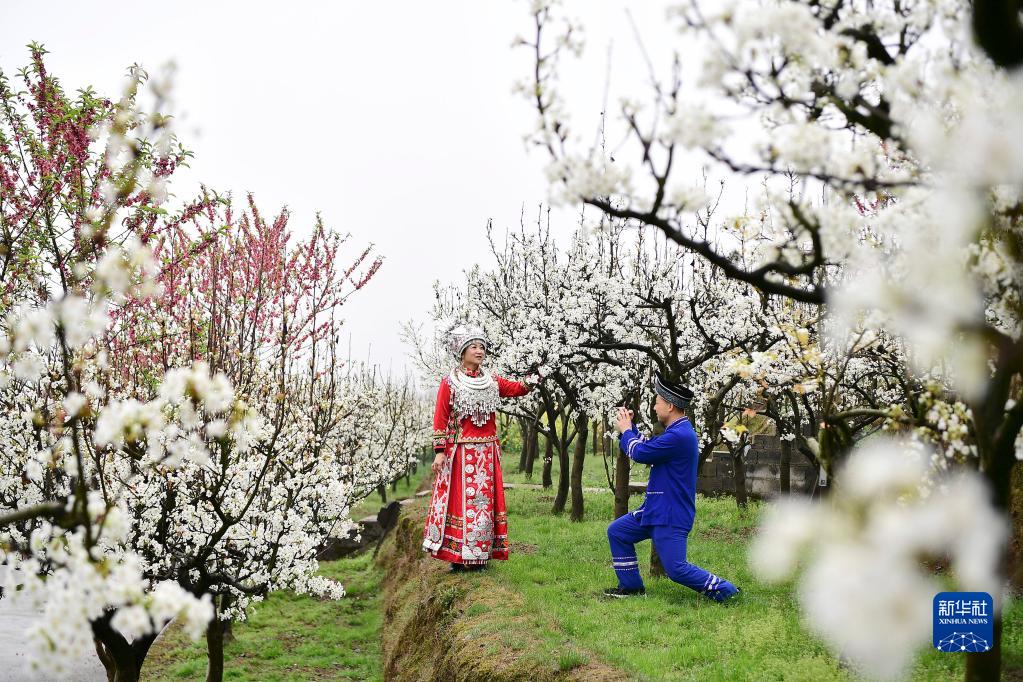 3月20日,在湖南省邵陽市城步苗族自治縣儒林鎮塔溪村,游客在香梨基地賞花拍照。