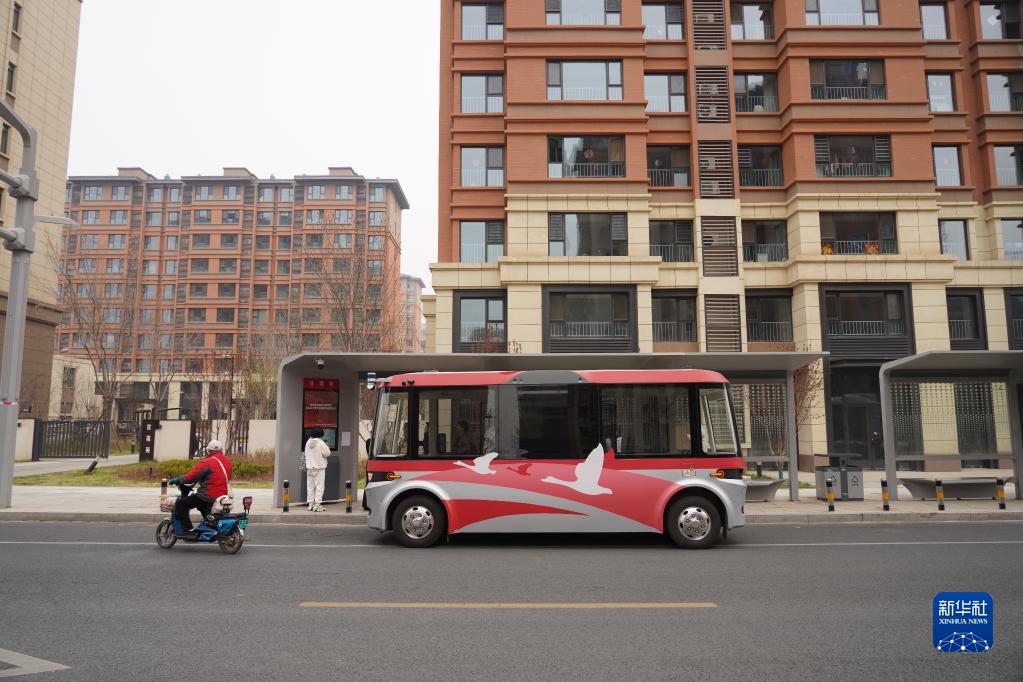 3月20日,智能網聯巴士901線測試車在河北雄安新區容東片區道路上???。