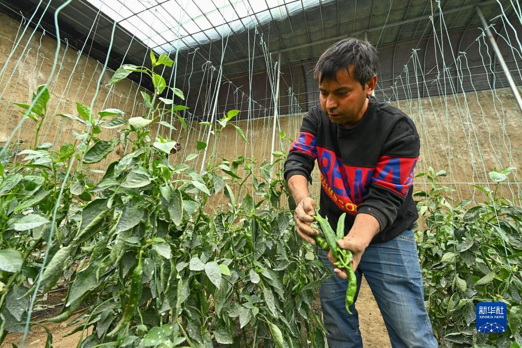 農民在新疆博湖縣現代設施農業示范基地物聯網日光溫室大棚采摘辣椒(3月19日攝)。