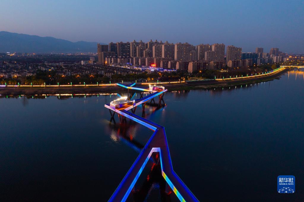 夜色中的浙江省金華市金東區東陽江(3月14日攝,無人機照片)。這里成為市民百姓散步休閑的好去處。