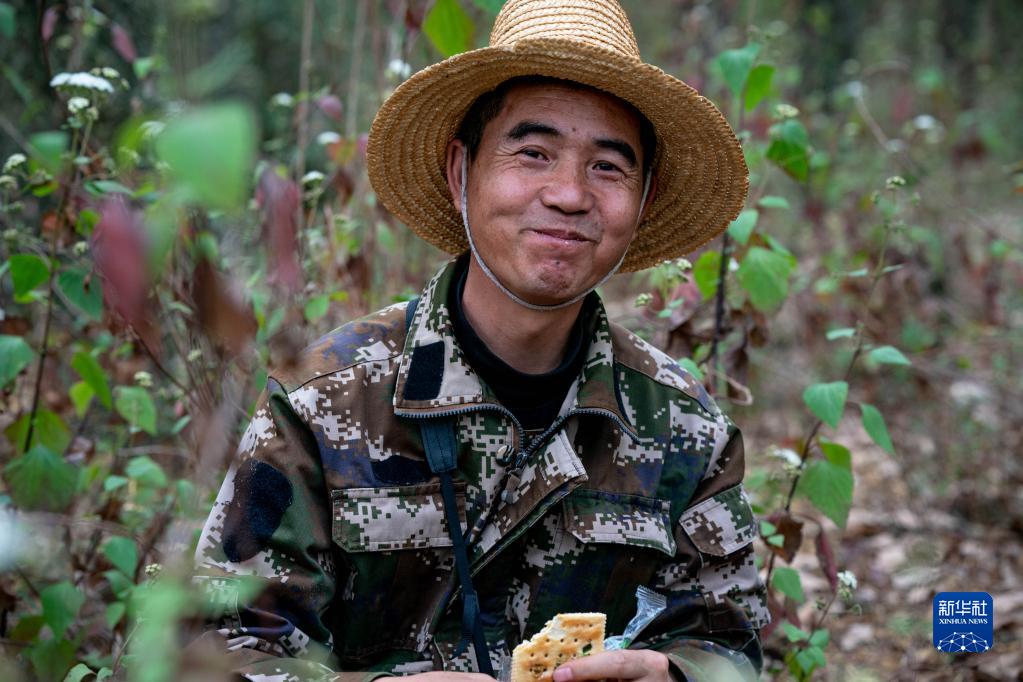 護林員陳華在巡山途中休息(3月20日攝)。