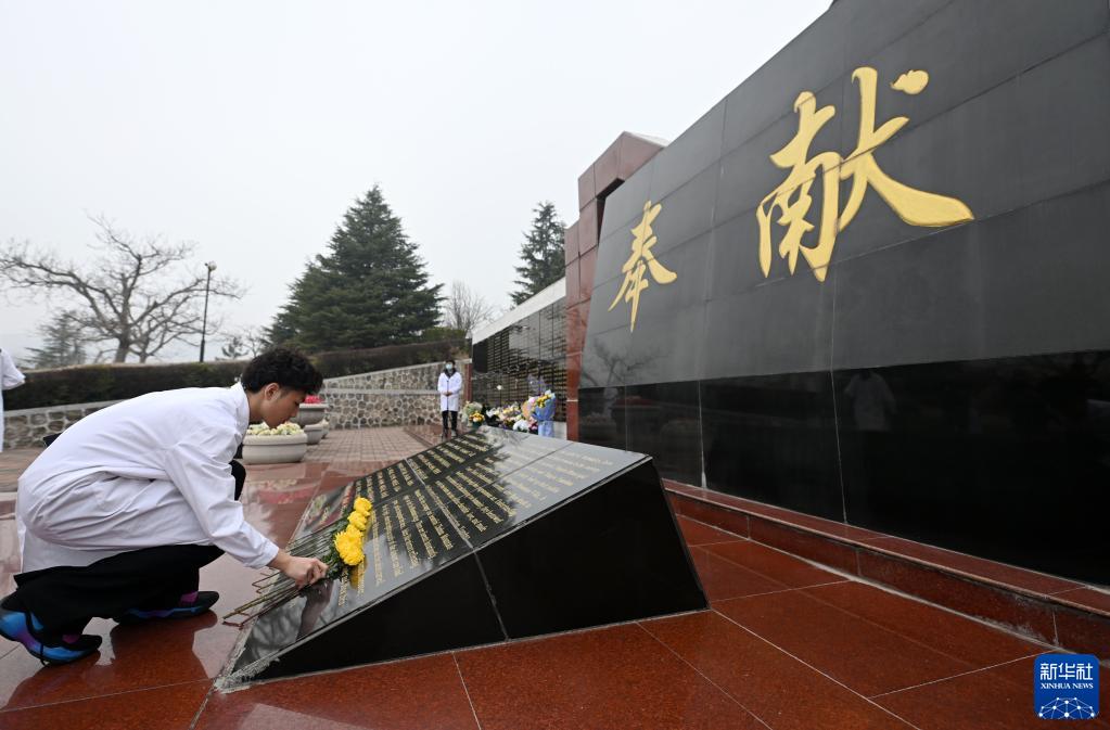 3月21日,在天津市薊州區元寶山莊生命紀念公園,天津醫科大學學生在奉獻碑前獻花。