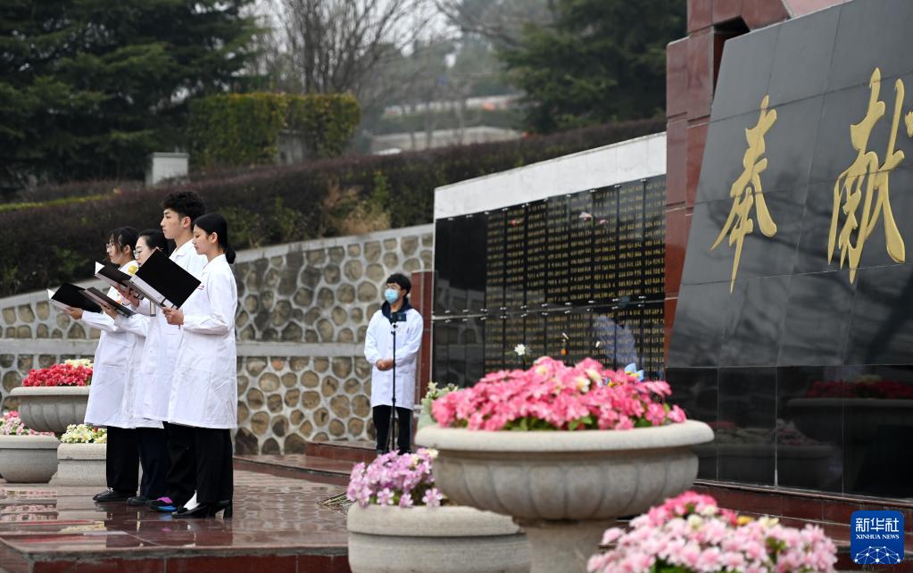 3月21日,在天津市薊州區元寶山莊生命紀念公園,天津醫科大學學生在奉獻碑前進行詩朗誦《生命的禮物》。