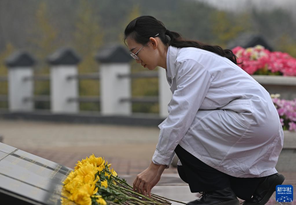 3月21日,在天津市薊州區元寶山莊生命紀念公園,天津醫科大學學生在奉獻碑前獻花。