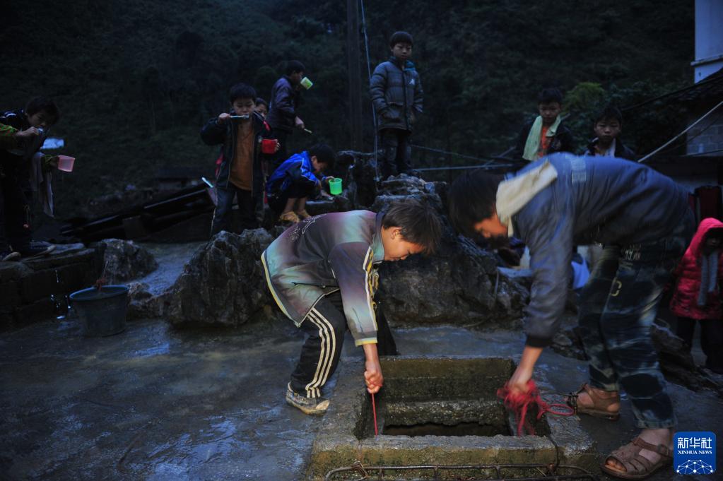 在廣西大化瑤族自治縣板升鄉弄勇小學,同學們從水柜里提水洗漱(2012年12月26日攝)。