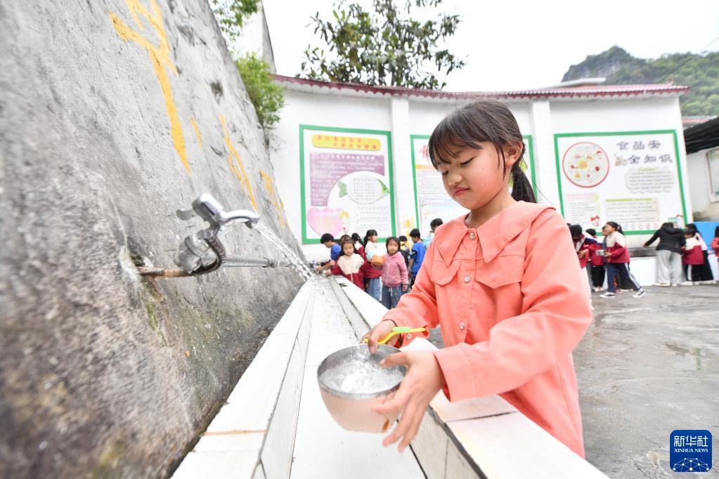 在廣西大化瑤族自治縣板升鄉八好小學,學生們用自來水洗碗(2023年3月20日)。十幾年前,學校僅有一個不足100立方米的水柜,用于收集儲存樓頂的雨水,學生用水要定期定量,遇到長時間不下雨,學校要到鄉政府所在地運水。2021年,當地抗旱應急供水工程投入使用,學校用上了十幾公里外的紅水河水,飲水難的問題得到徹底解決。