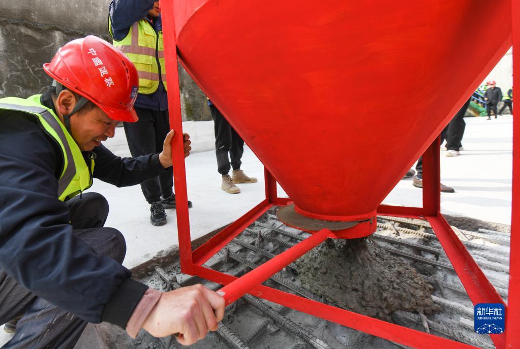 3月21日,在成都地鐵27號線金府站,中建三局的施工人員打開混凝土料斗放料。