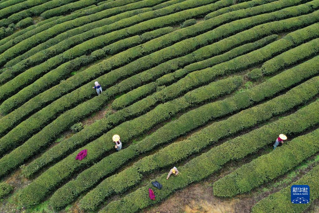 3月21日,在貴州省黔南布依族苗族自治州福泉市牛場鎮三江村山坪茶園,茶農在采摘春茶(無人機照片)。