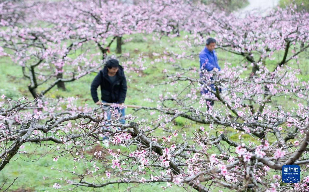 3月21日,農民在貴州省銅仁市萬山區魚塘鄉江屯村的果園里勞作。
