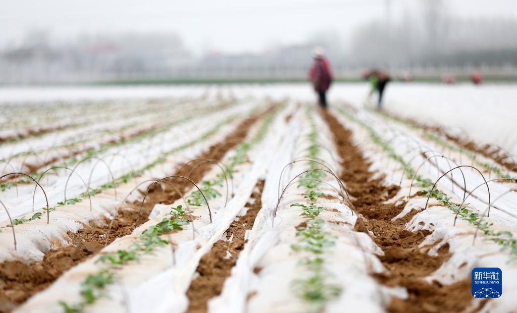3月21日,農民在山東省臨沂市郯城縣郯城街道的一處蔬菜種植基地勞作。