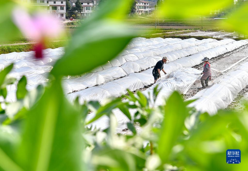 3月21日,四川省廣安市岳池縣茍角鎮紅朝門村村民在覆蓋農膜,進行水稻育秧。