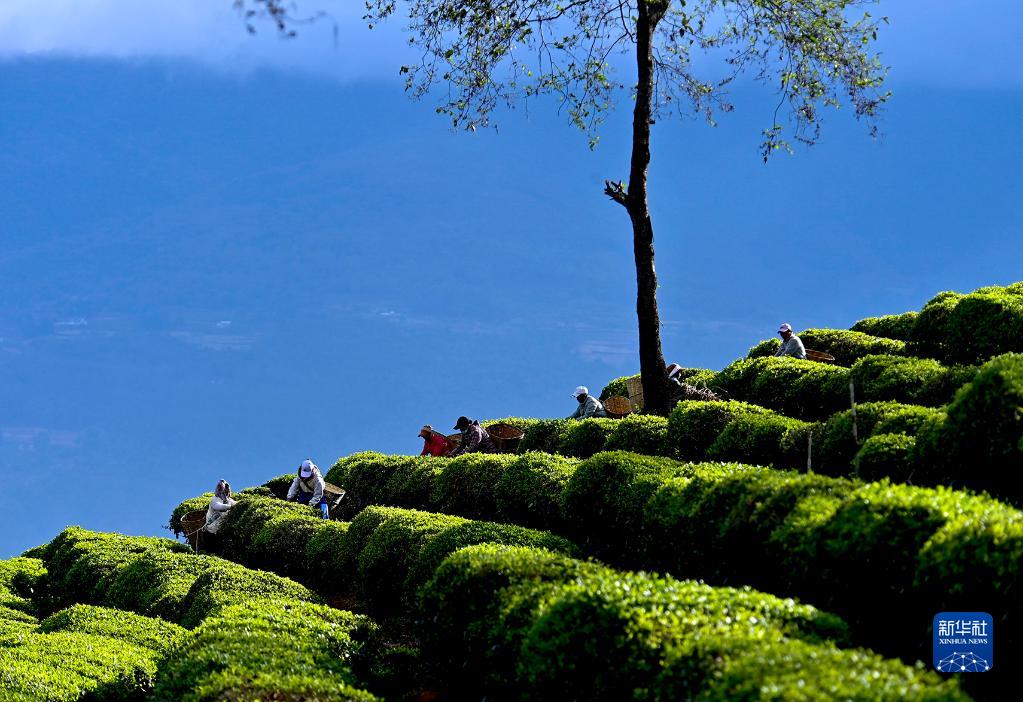 3月21日,云南大理南澗彝族自治縣公郎鎮羅伯克茶場的茶農在采摘春茶。