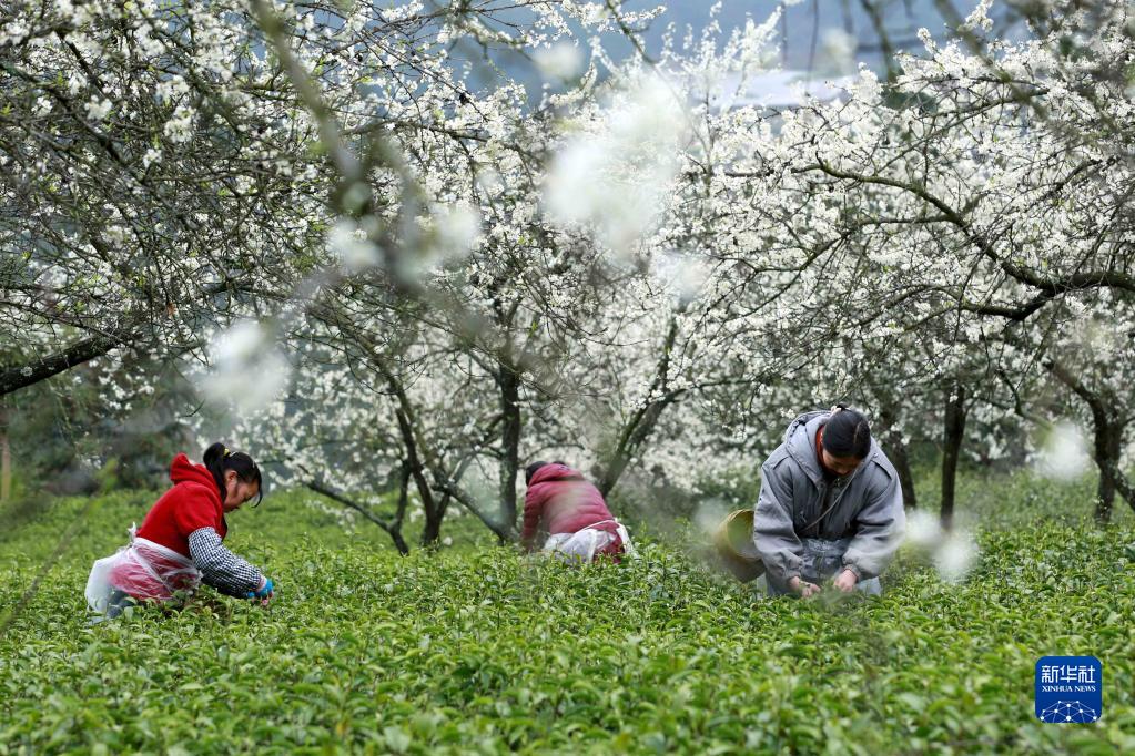 3月21日,在貴州省黔南布依族苗族自治州福泉市陸坪鎮福興村茶園,當地村民在采摘春茶。
