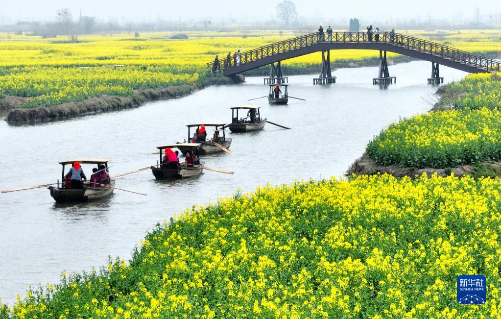 3月21日,游人在江蘇省興化市千垛菜花景區乘船游覽(無人機照片)。