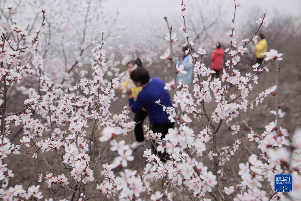 3月21日,游人在河北省遵化市劉備寨鄉泉水頭村的杏樹果園游玩。