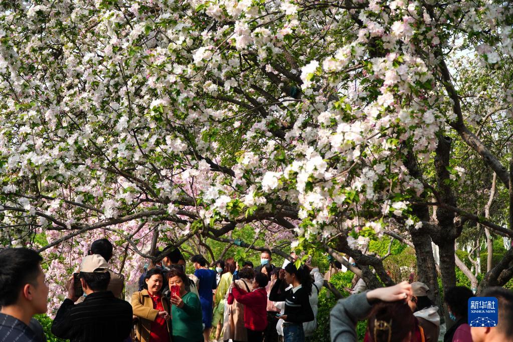 3月21日,在濟南市五龍潭公園,人們在觀賞盛開的海棠花。