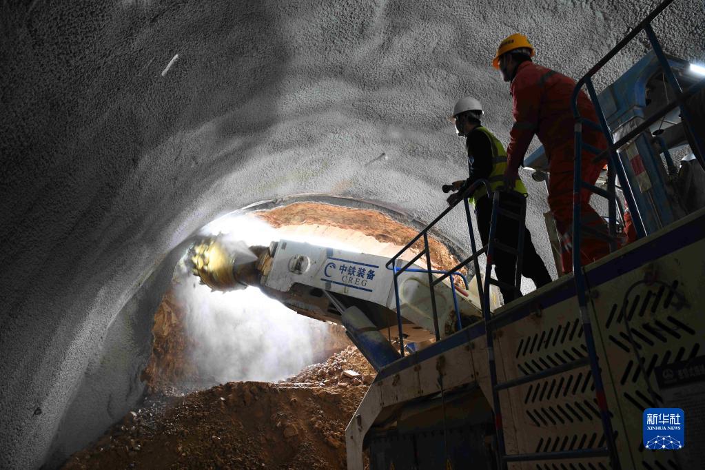 3月21日,中鐵四局施工人員在巢馬城際鐵路新大金山隧道進行貫通施工。
