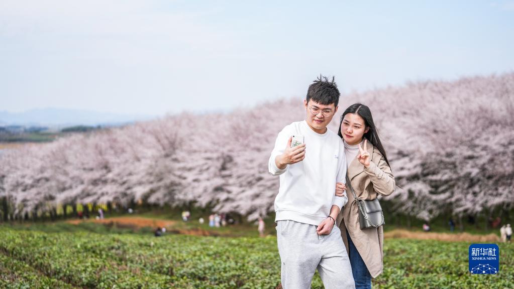 近日,貴州省貴安新區櫻花園內的2.4萬畝櫻花競相綻放,如雪似霞,吸引游客前來賞花觀光。