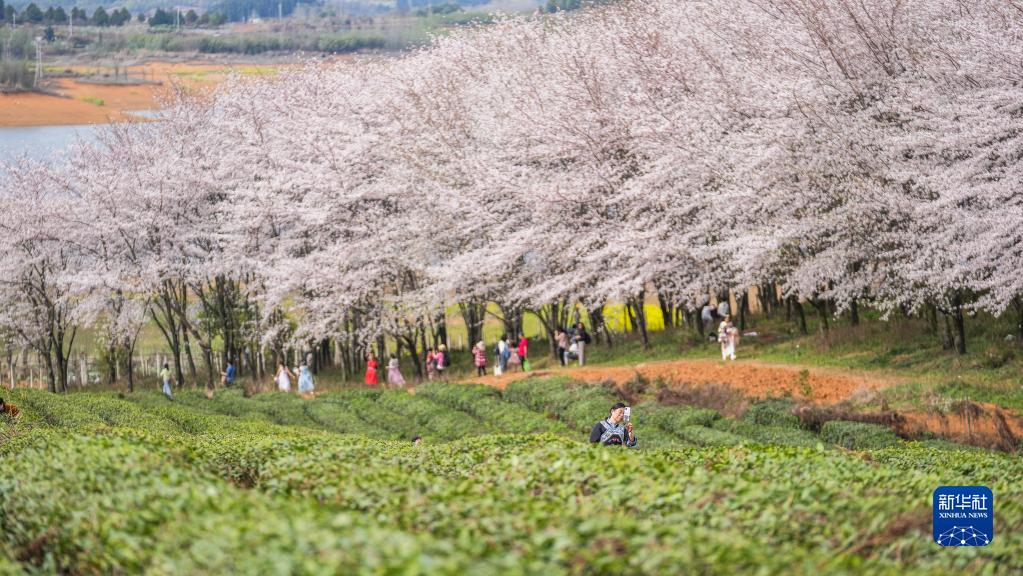近日,貴州省貴安新區櫻花園內的2.4萬畝櫻花競相綻放,如雪似霞,吸引游客前來賞花觀光。