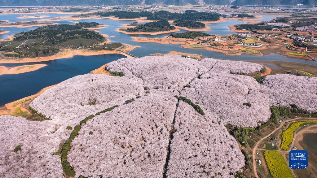 近日,貴州省貴安新區櫻花園內的2.4萬畝櫻花競相綻放,如雪似霞,吸引游客前來賞花觀光。