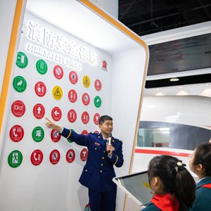 3月21日,在常德市科技館,消防員指導學生認識消防安全標志。