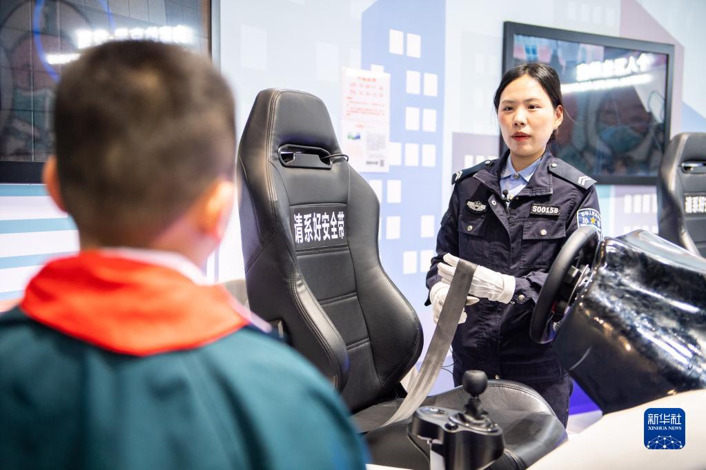 3月21日,在常德市科技館,交警為學生們介紹汽車安全帶使用方法。