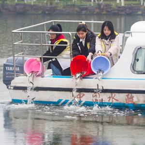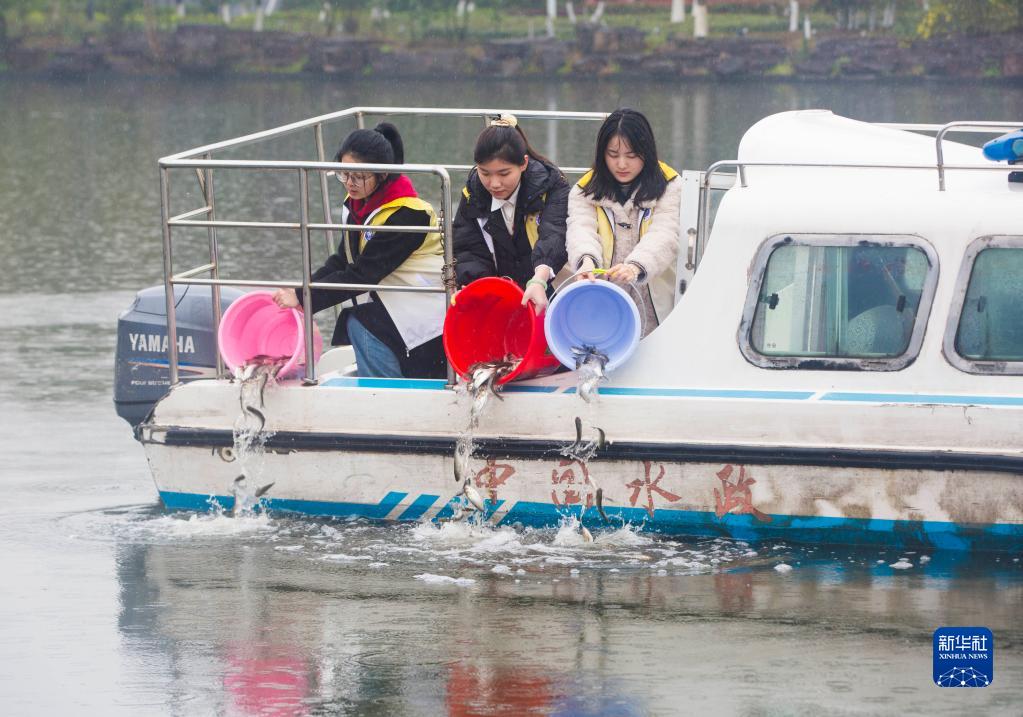 3月21日,在浙江省寧波市北侖區東泰河,志愿者將魚苗放流入河。