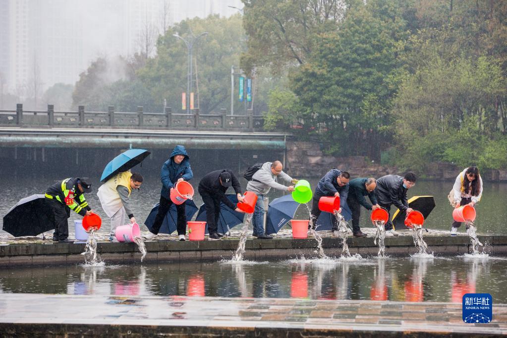 3月21日,在浙江省寧波市北侖區中心公園旁,志愿者向東泰河放流魚苗。