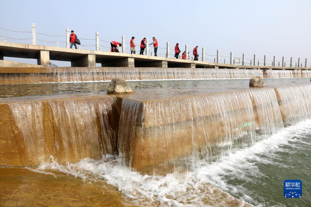 3月21日,在河北省石家莊市藁城區滹沱河段,志愿者在徒步巡河、撿拾垃圾。