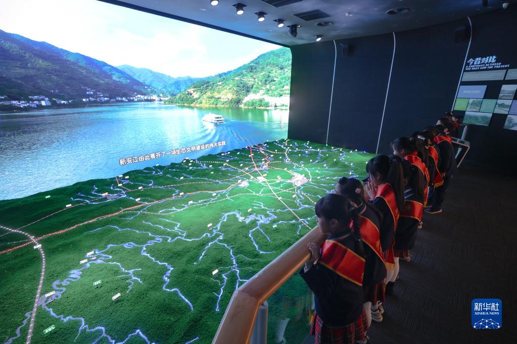 3月21日,安徽省黃山市屯溪大位小學的學生在新安江文明實踐中心觀看新安江文明實踐宣傳影片。
