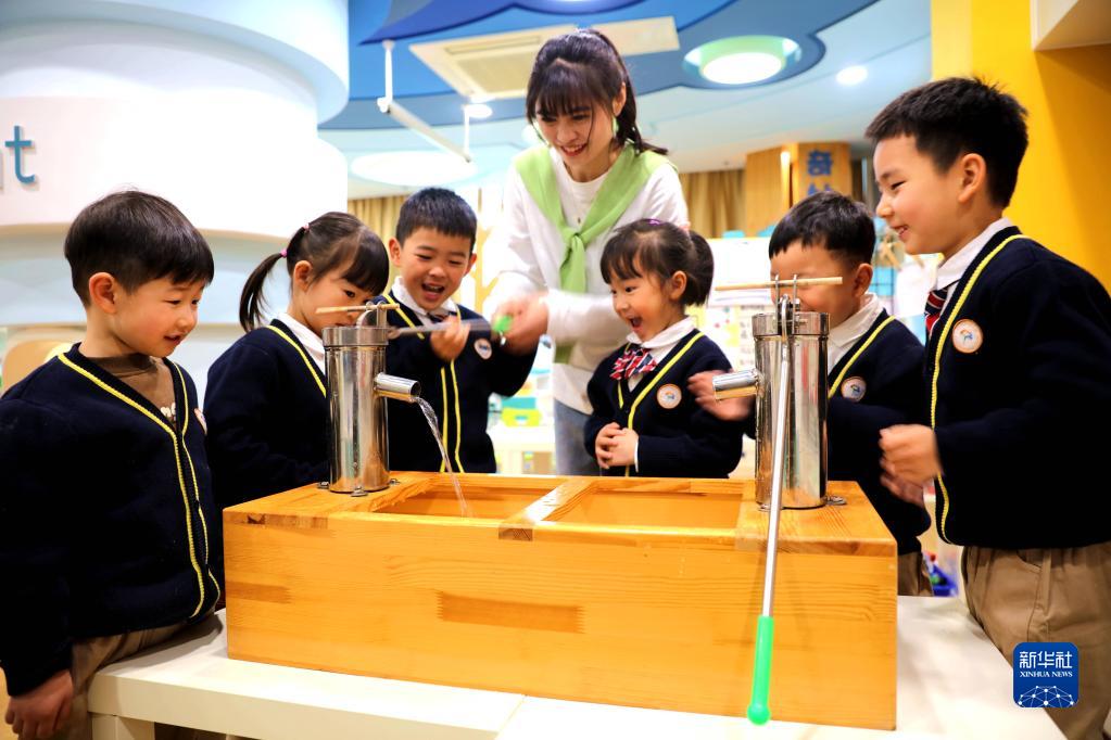 3月21日,在浙江省湖州市長興縣實驗幼兒園科探室里,老師和孩子們一起體驗壓力井出水游戲。
