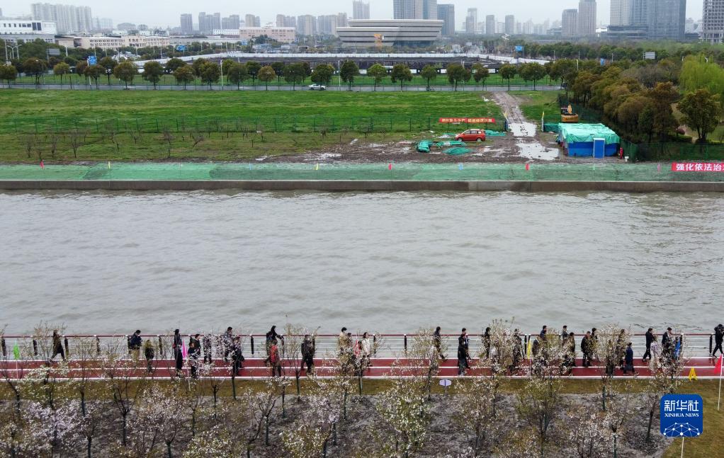 3月21日拍攝的位于洞涇港的松江新城綠環水脈建設現場(無人機照片)。