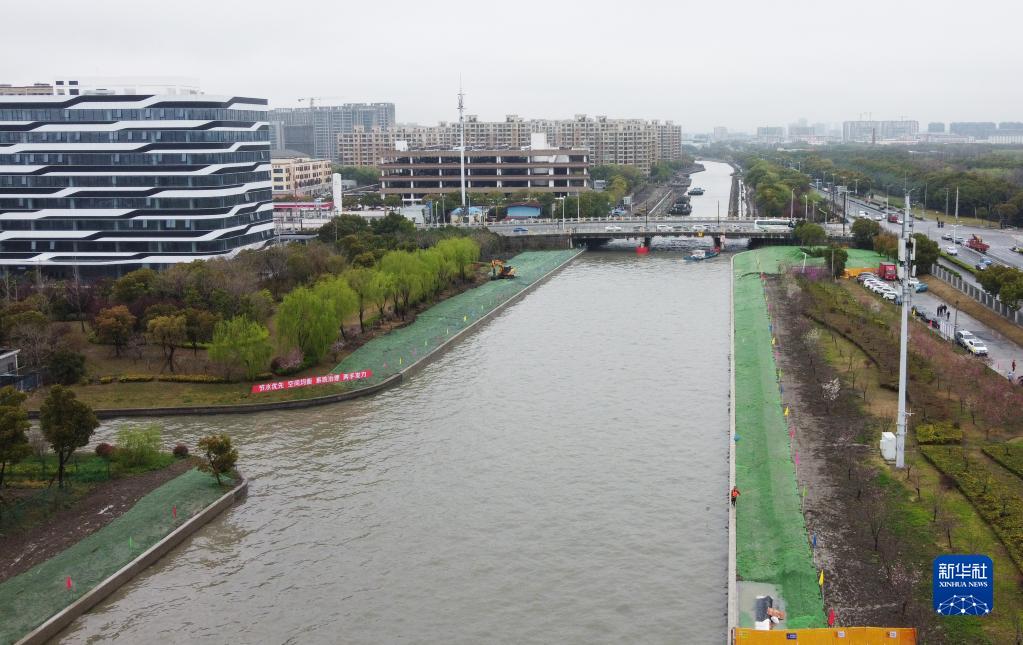 3月21日拍攝的位于洞涇港的松江新城綠環水脈建設現場(無人機照片)。