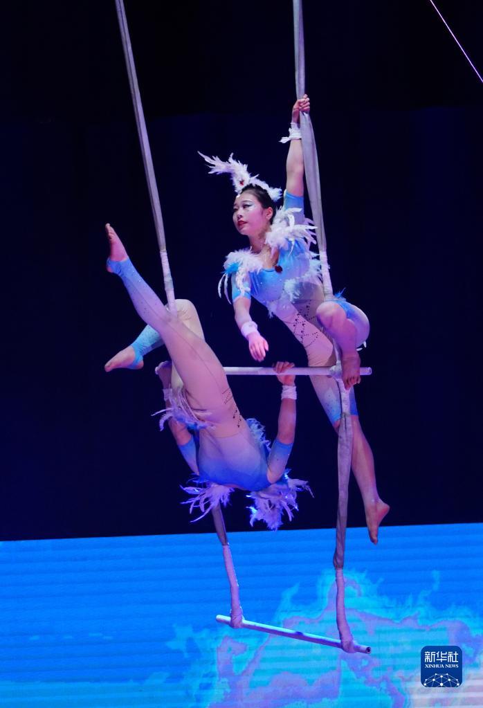 3月21日,在位于山東省濟南市的山東省會大劇院,演員表演雜技節目《雙人吊子》。