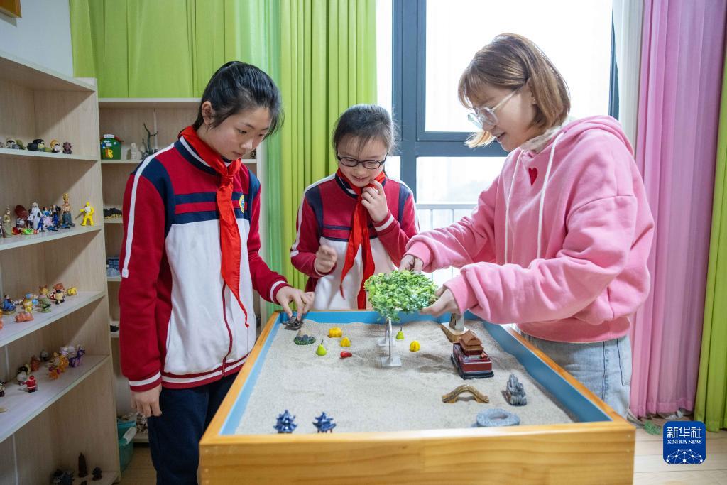 3月22日,寧波市江北區洪塘實驗學校的心理教師在心理輔導室陪學生一起擺放沙盤。