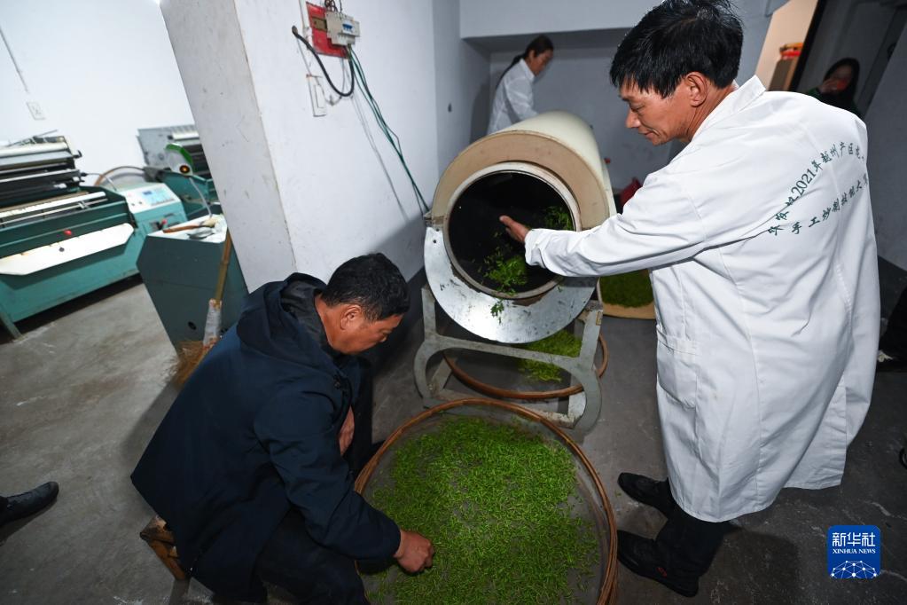 3月22日,趙家鎮東莊村上陽自然村“手工茶共富工坊”的致富帶頭人駱煌喜(右)查看高山有機茶的炒制情況。