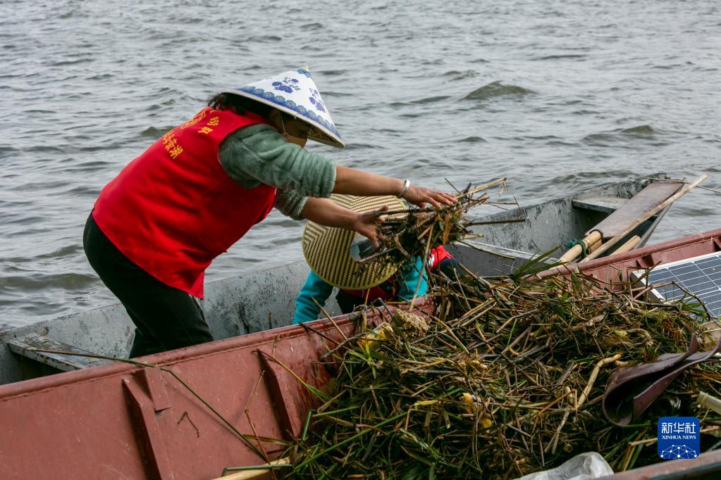 3月20日,巾幗打撈隊的隊員在處理打撈的枯枝落葉等。