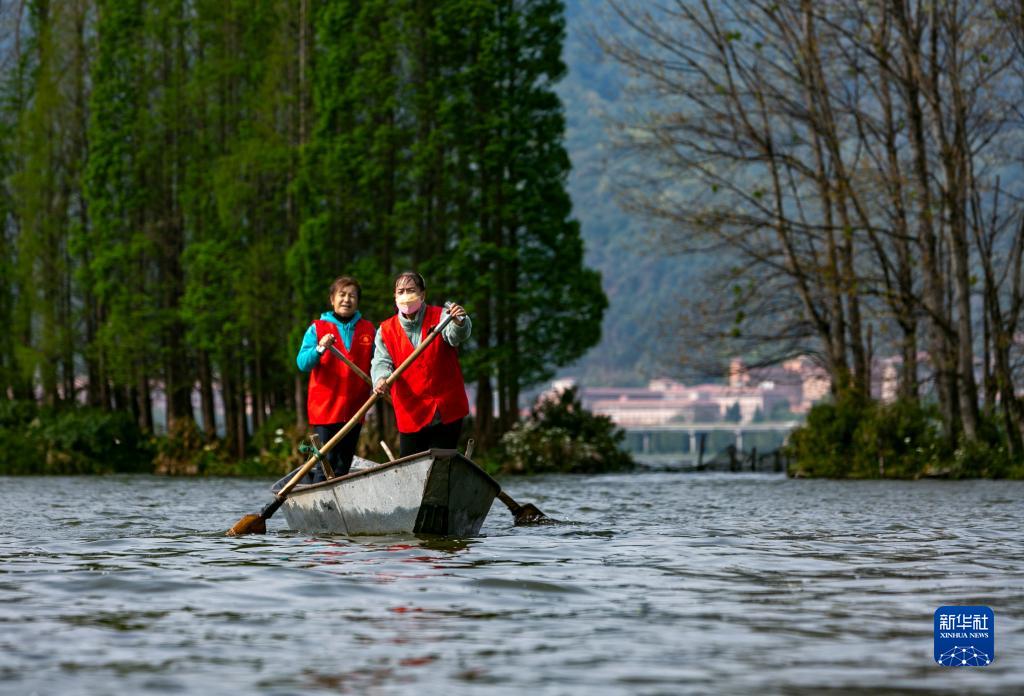 3月20日,滇池巾幗打撈隊的隊員在打撈工作結束后駕船返回。