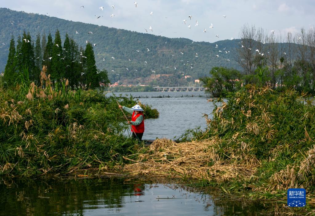 3月20日,巾幗打撈隊一名隊員在滇池草海水域進行打撈作業。