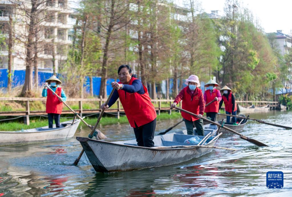 3月20日,李云麗(左二)帶領巾幗打撈隊隊員劃船準備到滇池草海開展打撈工作。