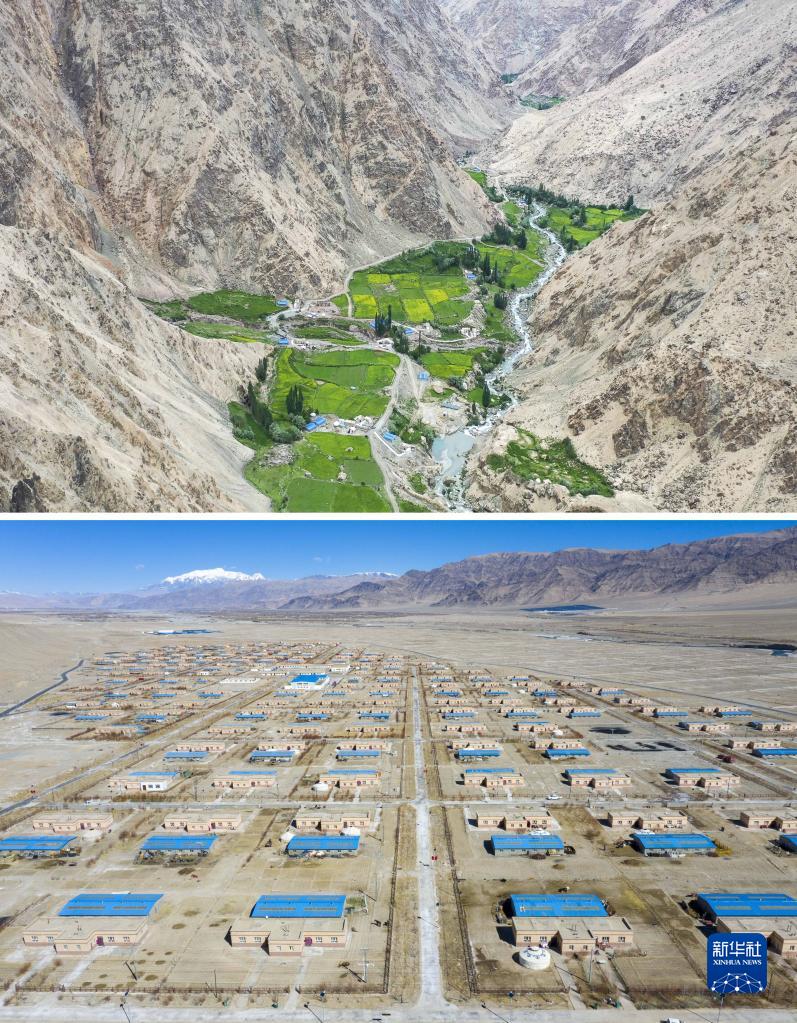 拼版照片:上圖為新娘古麗汗·贊加比力家易地扶貧搬遷前所住的馬爾洋鄉的山村一角(無人機照片,2019年6月28日攝);下圖為古麗汗家搬遷后所在的富民村、愛民村(無人機照片,2023年3月17日攝)。